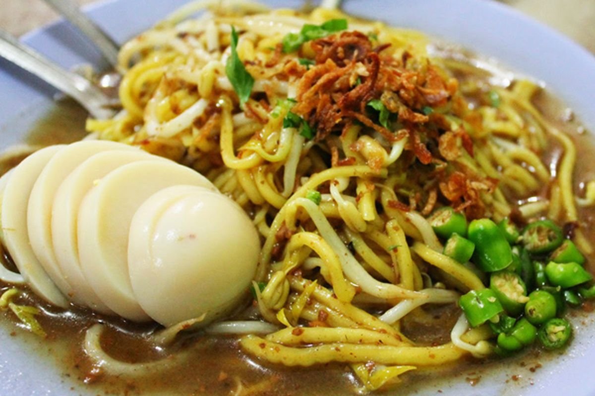 Namanya unik, tapi rasanya membuat ketagihan. Mie kuning direbus, lalu disiram kuah kental berwarna cokelat yang terbuat dari campuran ubi jalar, kacang tanah, dan bumbu rempah. Biasanya diberi telur rebus dan sambal cabai.